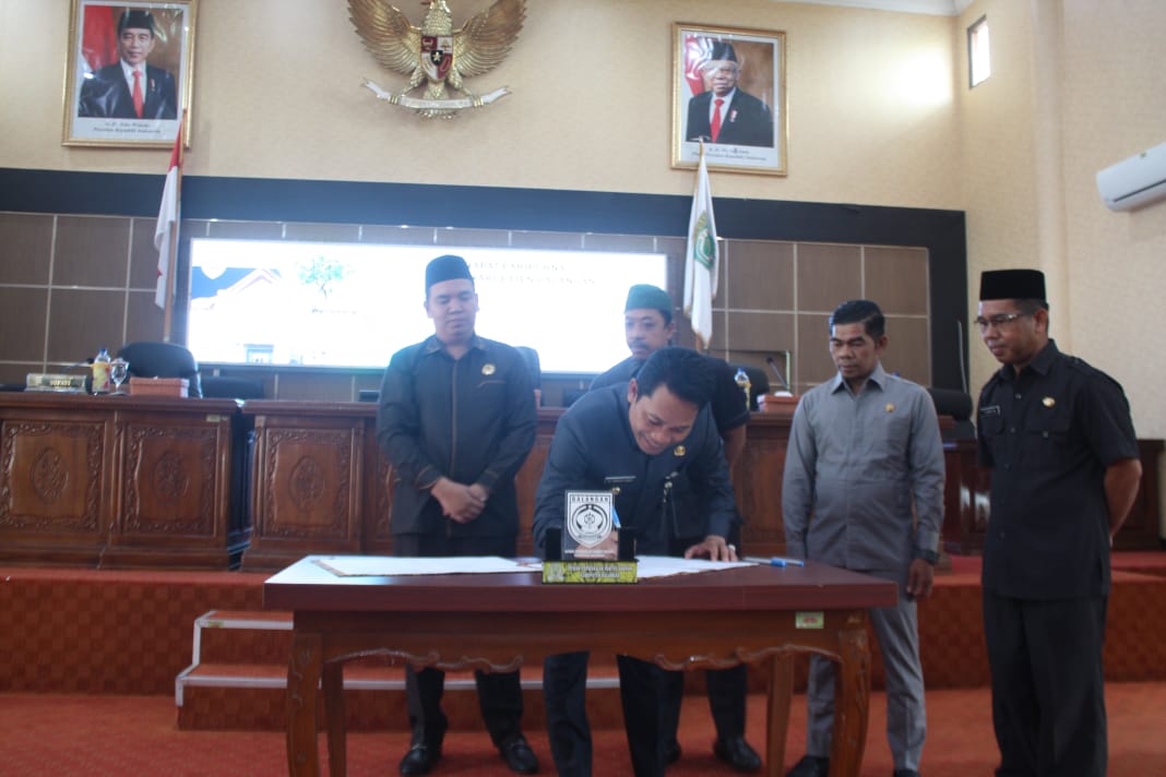 BALANGAN – Bupati Balangan H Abdul Hadi menandatangani persetujuan bersama dengan DPRD, terkait Raperda APBD 2023 dan dua Raperda pada rapat paripurna, Kamis (17/11).