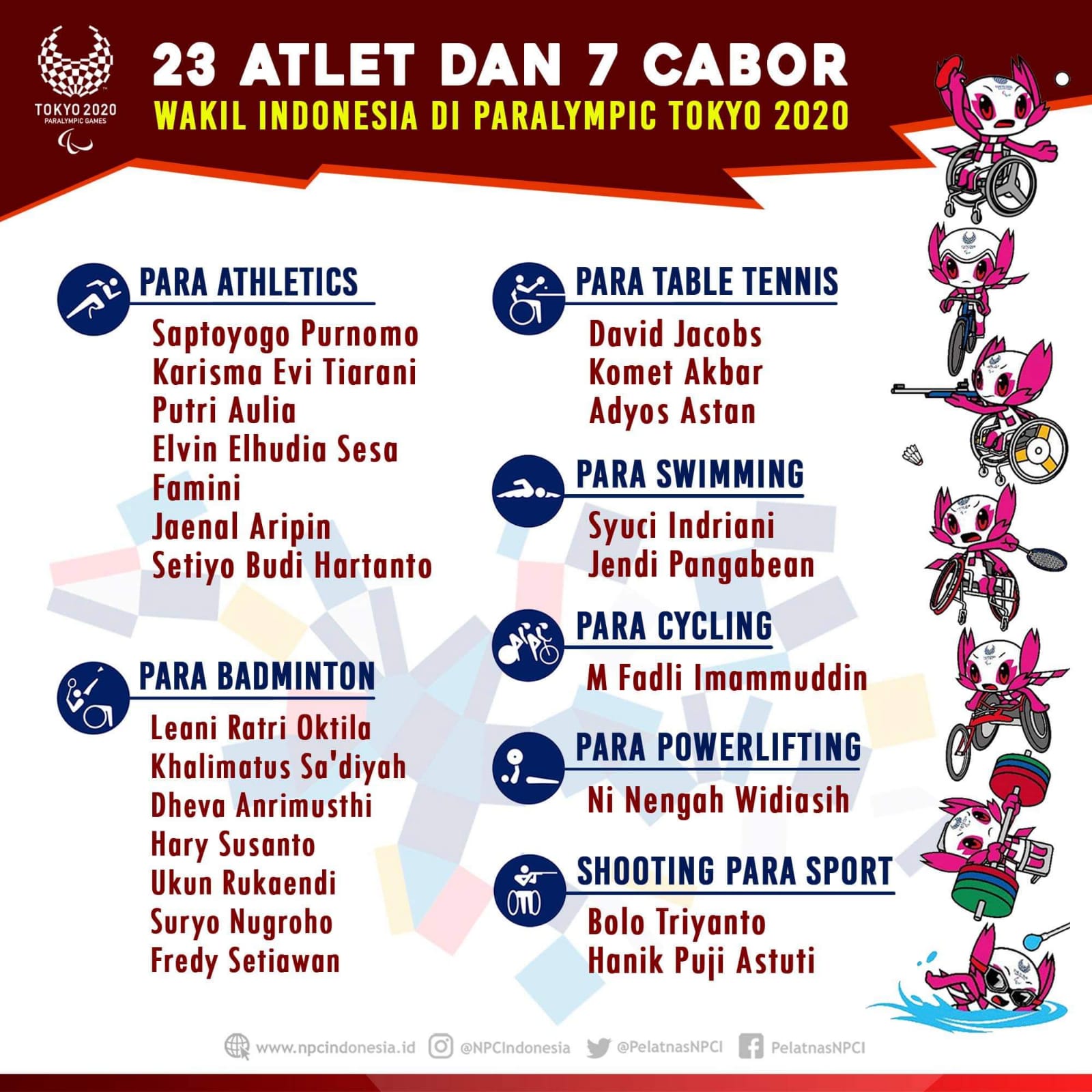 Di ajang Paralympic Tokyo, Indonesia akan mengirim 23 atlet disabilitas di tujuh cabang olahraga. (nn)