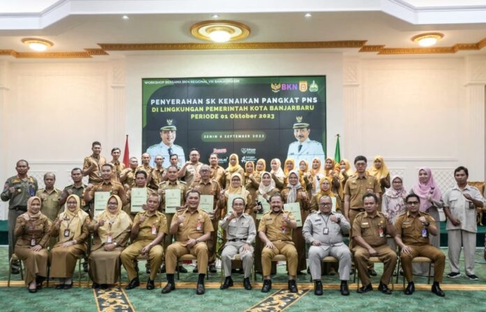 Banjarbaru – Walikota Banjarbaru, H. M. Aditya Mufti Ariffin menyerahkan secara Simbolis Surat Keputusan (SK) Kenaikan Pangkat Periode Oktober 2023 di Lingkungan Pemerintah Kota Banjarbaru, yang digelar di Aula Gawi Sabarataan Pemko Banjarbaru, pada Senin (04/09).
