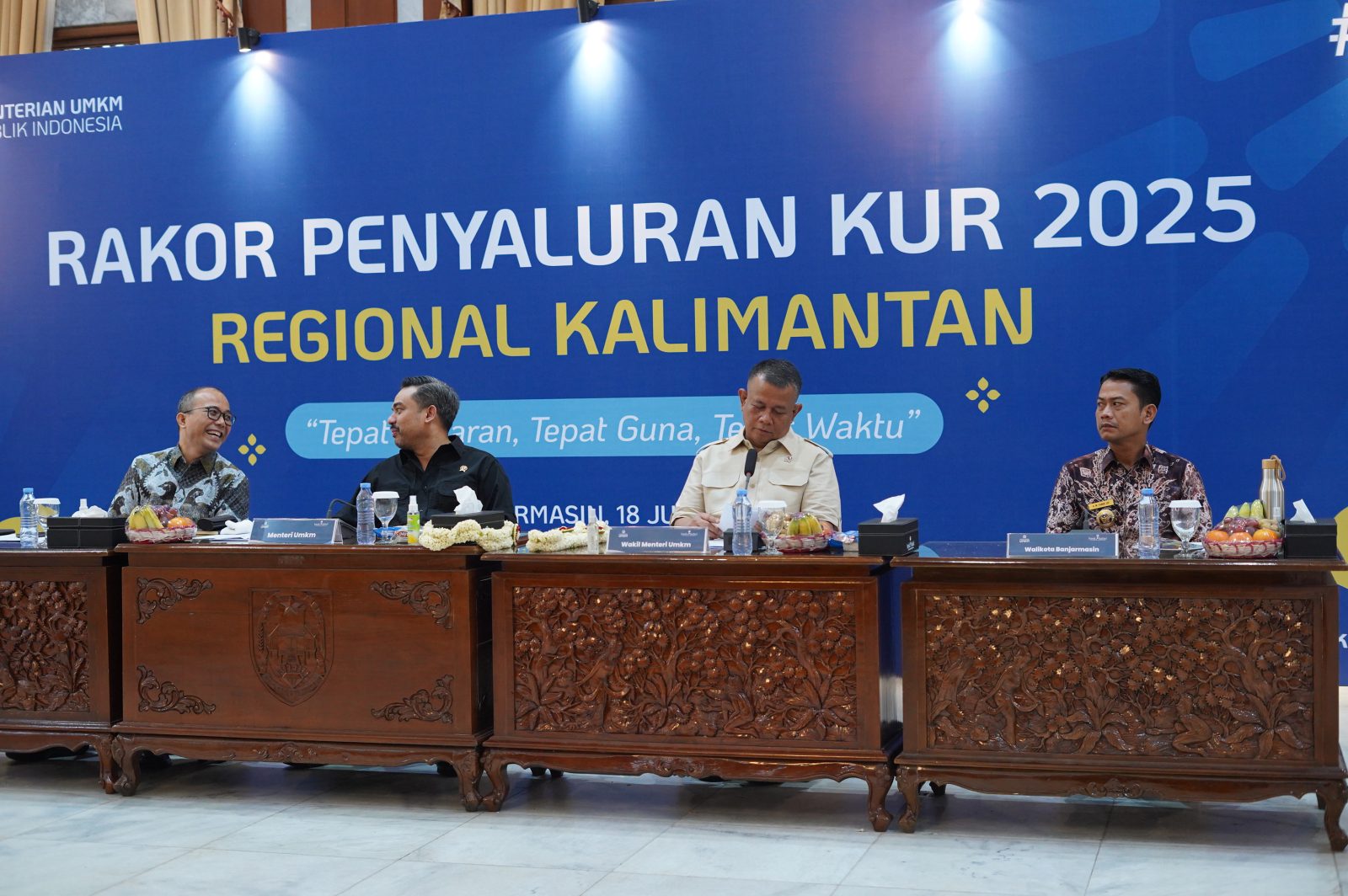 Rakor dipimpin langsung oleh Menteri Koperasi dan UKM RI, Maman Abdurrahman, didampingi Wakil Menteri Helvi Moraza, serta dihadiri perwakilan bank penyalur KUR, OJK, Jamkrindo dan instansi terkait dari lima provinsi se-Kalimantan.