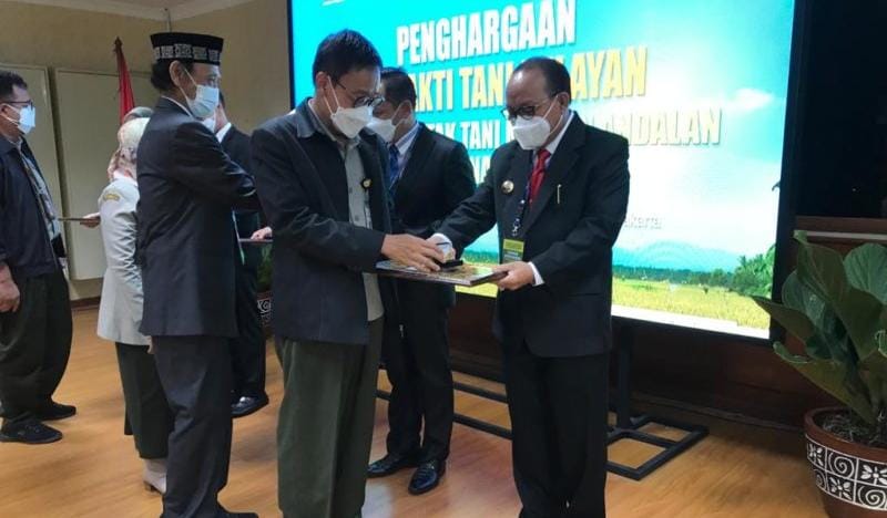 Piagam penghargaan yang ia terima berupa Lencana Adhi Bhakti Tani Nelayan Pratama atas kontribusi positif dirinya terhadap dunia pertanian dan perikanan Bumi Sarabakawa.