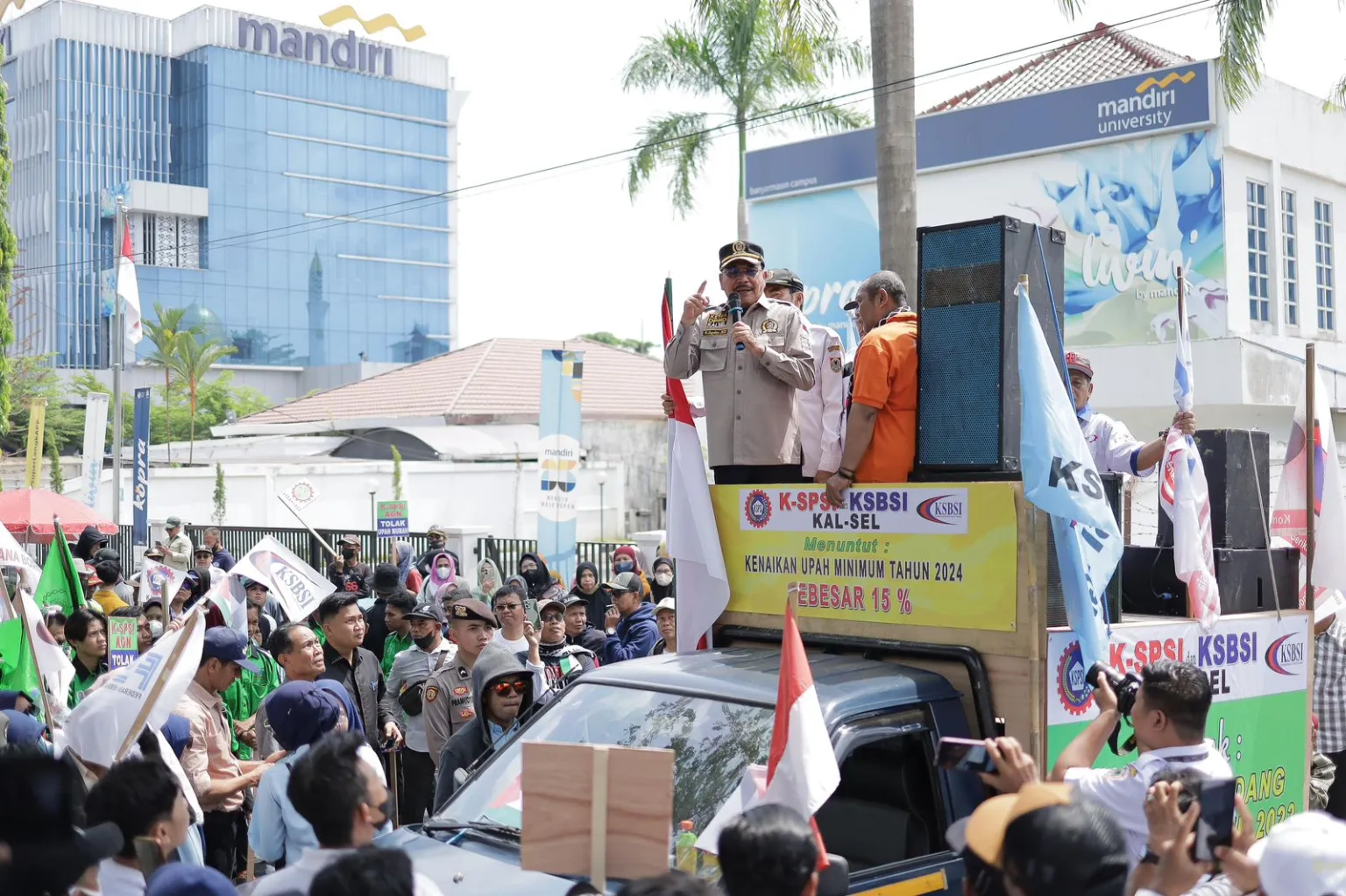 Banjarmasin – Konfederasi Serikat Pekerja Seluruh Indonesia (KSPSI) dan Konfederasi Serikat Buruh Seluruh Indonesia (KSBSI) Provinsi Kalimantan Selatan (Kalsel) menggelar aksi demo menuntut kenaikan Upah Minimum Provinsi (UMP) di depan Gedung Rumah Banjar DPRD Provinsi Kalsel, Rabu (15/11).