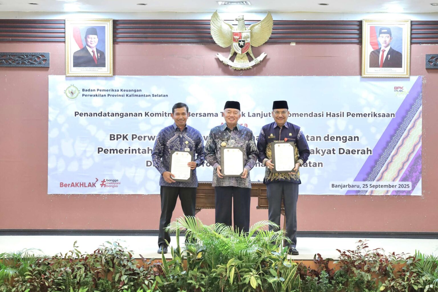 RETORIKABANUA.ID, Banjarbaru – DPRD Kalsel menegaskan komitmennya dalam mendukung percepatan penyelesaian rekomendasi hasil pemeriksaan BPK RI. Hal ini ditegaskan langsung oleh Ketua DPRD Kalsel, Supian HK, dalam acara Penandatanganan Komitmen Bersama TLRHP (Tindak Lanjut Rekomendasi Hasil Pemeriksaan) yang digelar BPK Perwakilan Kalsel, Kamis (25/9), di Aula Gedung BPK RI Kalsel, Banjarbaru.