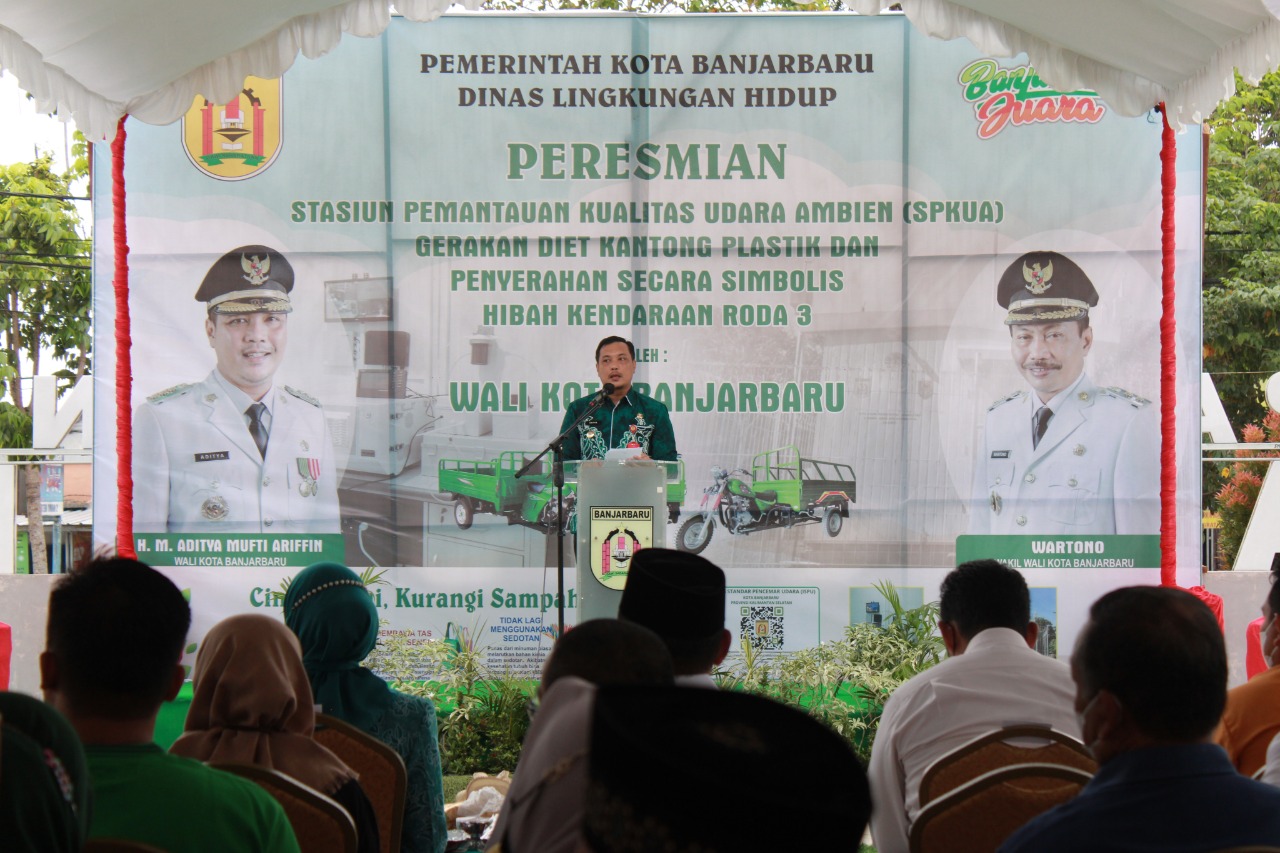 BANJARBARU – Wali Kota Banjarbaru Aditya Mufti Ariffin bersama Ketua TP-PKK Vivi Mar’i Zubedi Aditya Mufti Ariffin, menghadiri launching Gerakan Diet Kantong Plastik dan Peresmian Stasiun Pemantauan Kualitas Udara Ambien (SPKUA) Otomatis, sekaligus penyerahan secara simbolis hibah kendaraan roda tiga angkutan sampah, Jumat (26/8), di Pasar Bauntung.