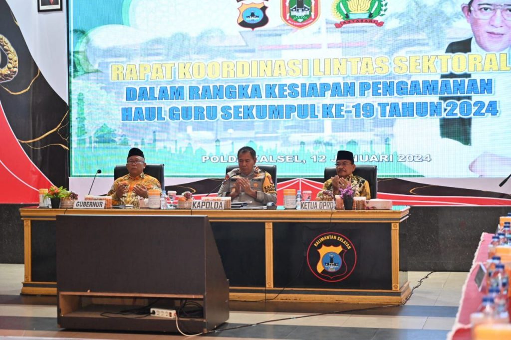 Banjarmasin – Gubernur Kalimantan Selatan, H Sahbirin Noor yang diwakilkan oleh Staf Ahli Bidang Pemerintahan dan Hukum dan Politik, Sulkan mengikuti Rapat Koordinasi lintas sektoral dalam rangka kesiapan pengamanan Haul Muhammad Zaini Abdul Ghani (Abah Guru Sekumpul) ke-19, di aula Mathilda Polda Kalsel di Banjarmasin, Jumat (12/1).