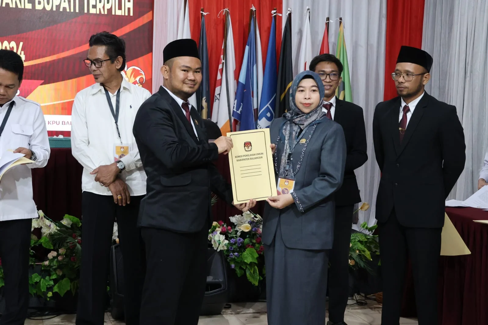 RETORIKABANUA.ID, Balangan – Ketua Dewan Perwakilan Rakyat Daerah (DPRD) Kabupaten Balangan, Linda Wati, menerima salinan Surat Keputusan (SK) penetapan Bupati dan Wakil Bupati Balangan terpilih periode 2025-2030, Kamis (9/1). SK tersebut diserahkan langsung oleh Ketua KPU Balangan, Ahmad Turjani, dalam rapat pleno terbuka Komisi Pemilihan Umum (KPU) Kabupaten Balangan yang digelar di Aula KPU Balangan.