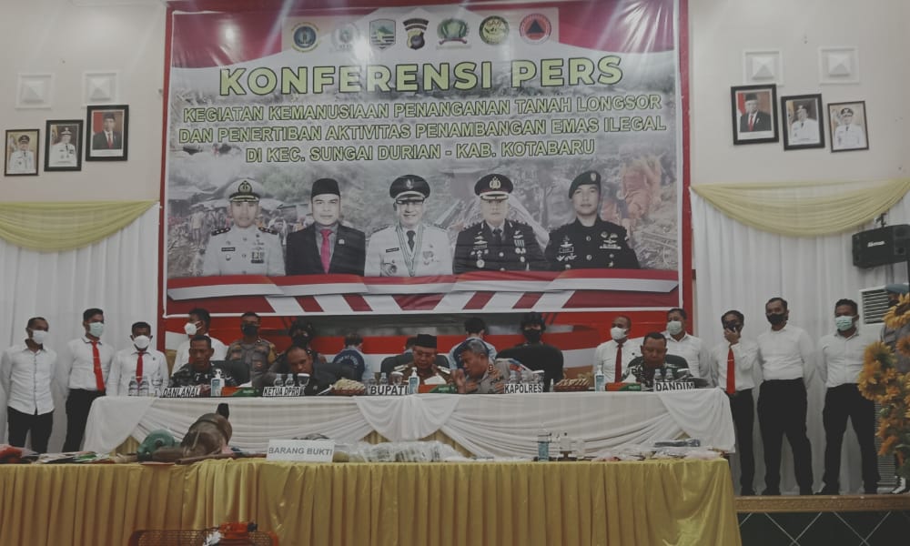 KOTABARU – Ketua DPRD Kabupaten Kotabaru Syairi Mukhlis menghadiri Konferensi Pers Kegiatan Kemanusian Penambanganan Tanah Longsor dan Penertiban Aktivitas Penambangan Emas Ilegal di Kecamatan Sungai Durian Kotabaru, Senin (10/10), di Op Room Sekda Kotabaru.