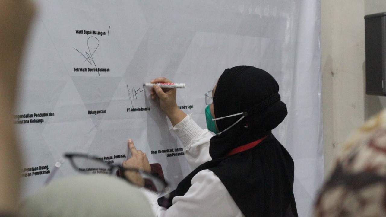Sosialisasi sekaligus penandatanganan komitmen bersama Balangan Lawan Stunting (Balanting) dilakukan Bupati Balangan diwakili Sekretaris Daerah, kepala SKPD, perwakilan PT Adaro Group, camat dan 28 desa yang masuk dalam Pokja.