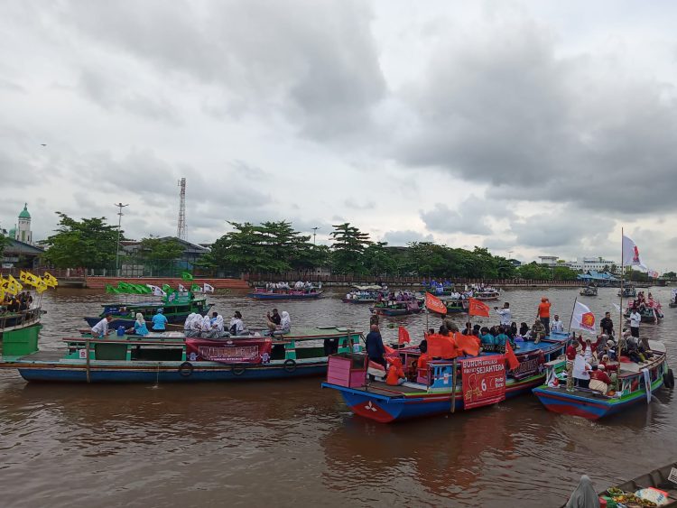 Kirab Pemilu 2024 dilakukan dengan cara menyusuri Sungai Martapura menaiki perahu bermotor (kelotok) yang dihiasi berbagai macam atribut masing-masing partai politik.