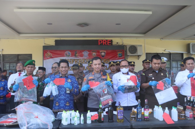 “Disini sudah kita kumpulkan, untuk barang bukti yang berhasil disita yakni 69 botol miras, 76 botol alkohol, dan 14 liter tuak,” tegasnya.