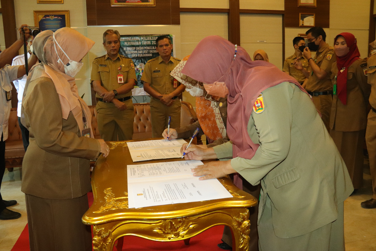 BANJARBARU-Sekretaris Daerah Kota Banjarbaru Drs H Said Abdullah MSi menyaksikan penandatanganan perjanjian kinerja perubahan tahun 2021 oleh aparatur sipil negara (ASN) Badan Pengelolaan Keuangan dan Aset Daerah Kota Banjarbaru, Senin (15/11).